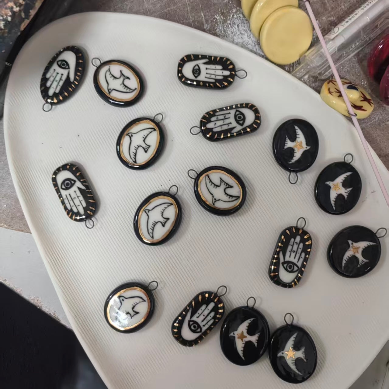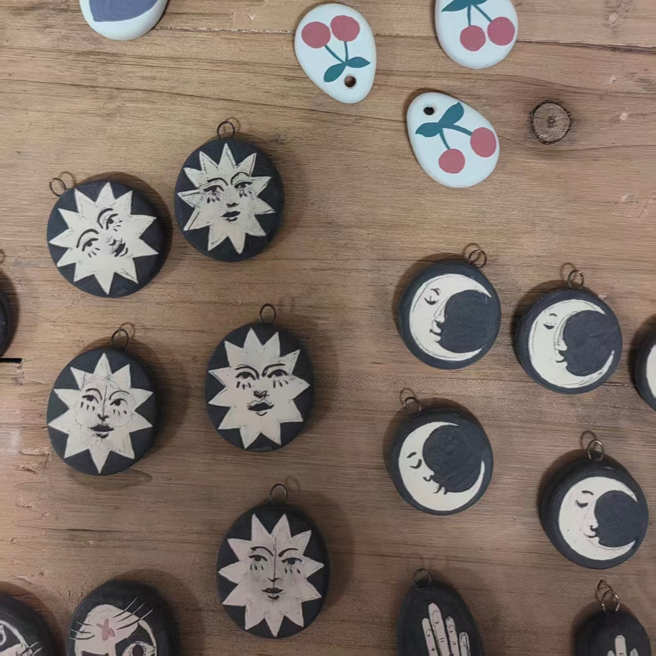 Handmade ceramic necklace, black ceramic pendant series, natural boho style, rustic nature-inspired design.